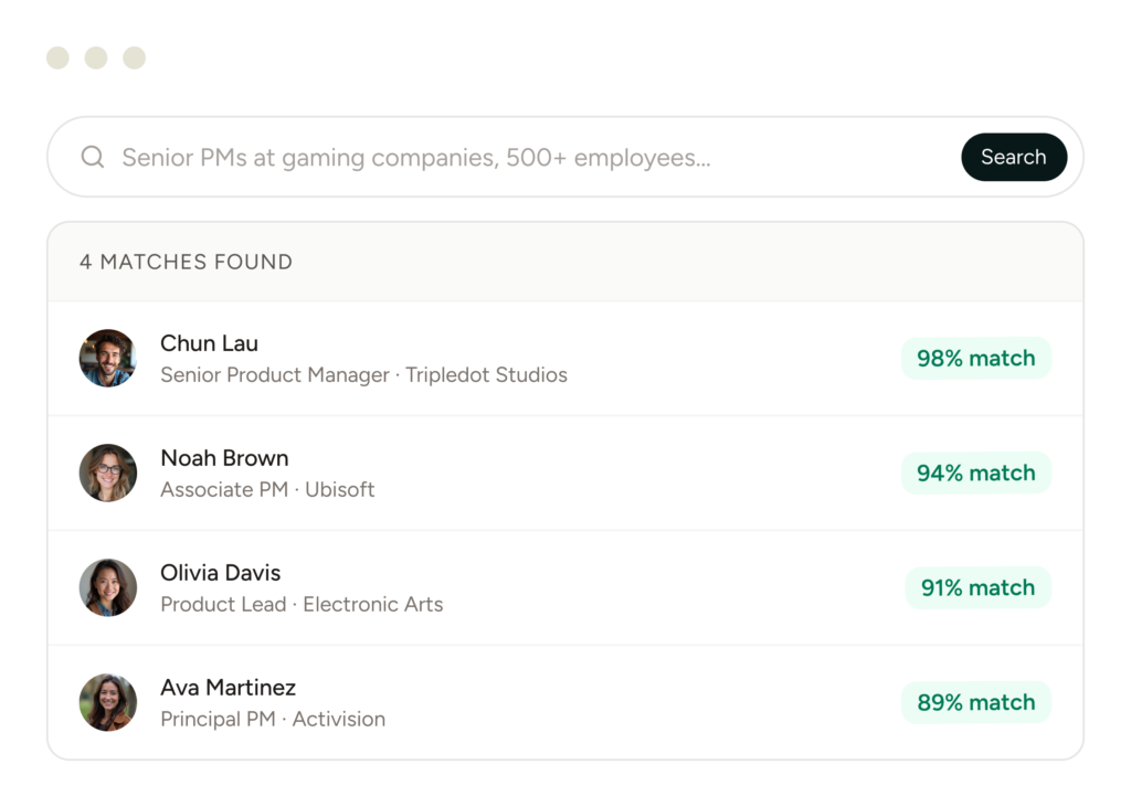 Describe who you want to reach in plain English. Lilian’s AI searches across 500M+ verified contacts to surface the exact decision-makers that match your ICP no Boolean strings, no manual filters.