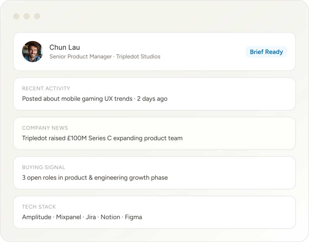 Before your reps write a single word, Lilian compiles rich contact profiles LinkedIn activity, company news, funding rounds, tech stack, recent hires summarised into a crisp brief ready for outreach.