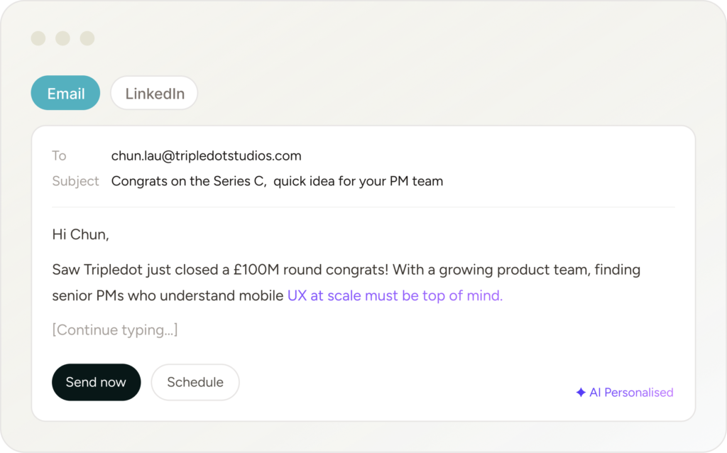 Lilian drafts hyper-personalised emails, LinkedIn messages and call scripts grounded in your research so every touchpoint feels handcrafted, not blasted. Launch multi-channel sequences in one click.